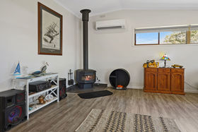 Step inside to discover a bright & open-plan kitchen/dining and massive lounge, all cleverly designed to capture the stunning coastal outlook. The contemporary kitchen features gas cooking, ample storage and sleek finishes, making it the ideal hub for family life or entertaining. A wood fire and reverse cycle provide comfort throughout the seasons.