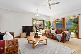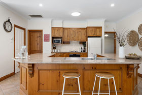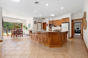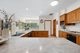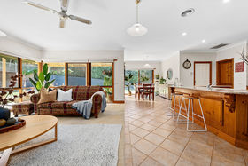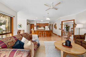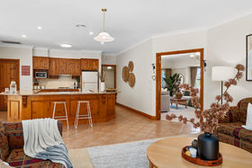 At the heart of the home sits a warm timber kitchen, thoughtfully designed with ample cabinetry and quality appliances including an oven, gas cooktop, rangehood, and dishwasher. The kitchen seamlessly overlooks the central living and meals area, creating a connected space ideal for both daily living and entertaining.