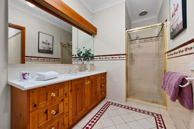 The federation-influenced home offers three generous bedrooms plus a dedicated study. The master suite is well appointed with a walk-in robe and ensuite, while the remaining bedrooms are also fitted with walk-in robes, providing excellent storage and everyday functionality.